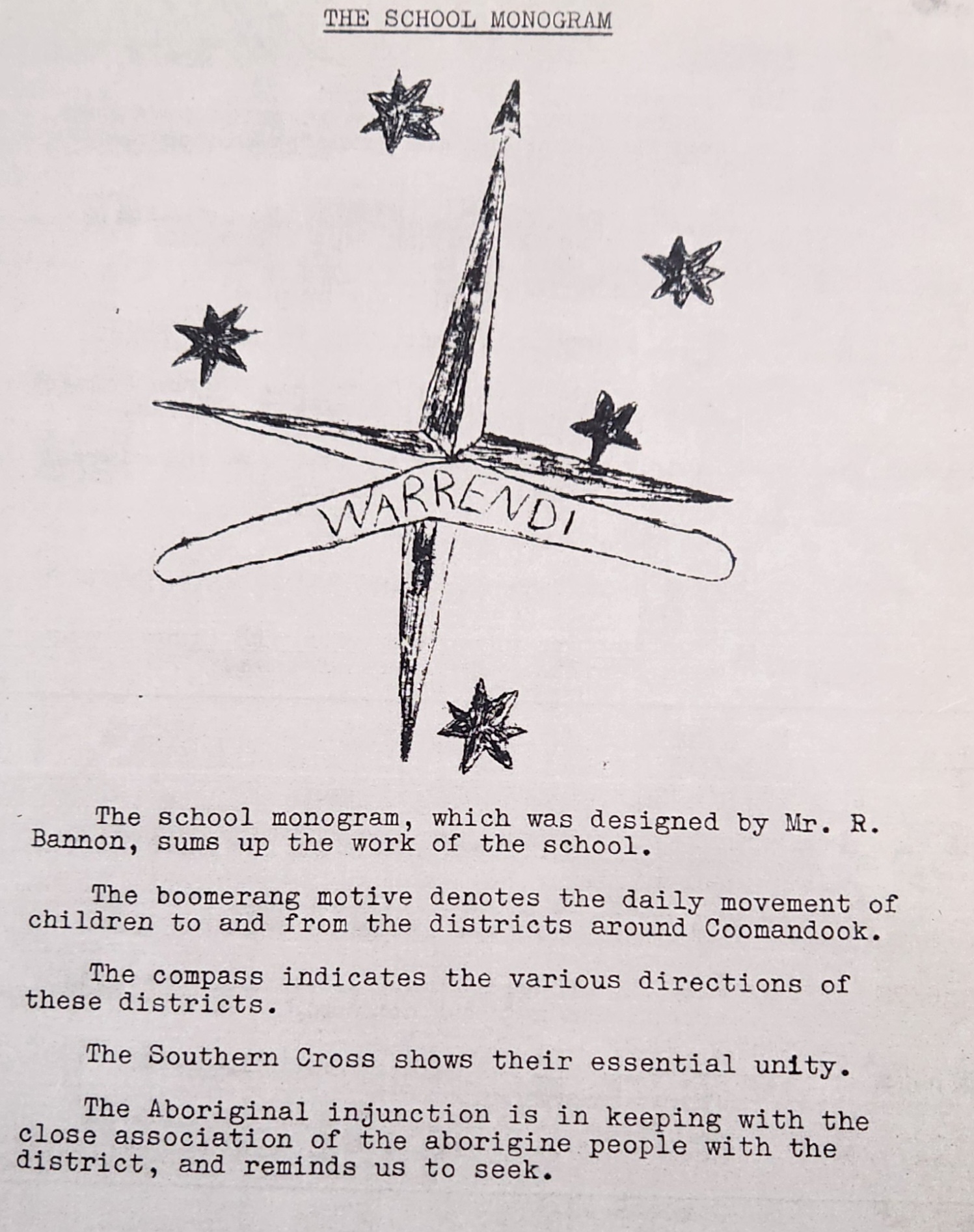 The school emblem, designed by Mr R. Bannon, incorporates a boomerang, compass, and the Southern Cross. Each element symbolises key aspects of the school’s identity: